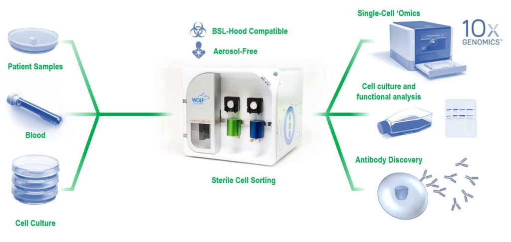 The WOLF® benchtop cell sorter uses sterile, disposable cartridges with no cross-contamination between samples and fits inside a biosafety cabinet ensuring the safe handling of biohazard materials COVID-19 researchers can utilize the WOLF cell sorter for optimal sample preparation in single-cell “-omics”, cell isolation for culturing, or antibody discovery. Whether performing immune profiling, antibody discovery, or functional assays, the WOLF in your lab can ensure the ability to continue while core facilities are still shut down is critical.