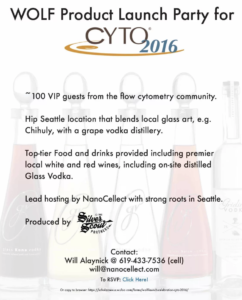 NanoCellect officially launches the WOLF Cell Sorter at CYTO 2016. Come and visit us if you are town. Come celebrate Tuesday night Glass Distileray starting at 7pm (Registration Required).